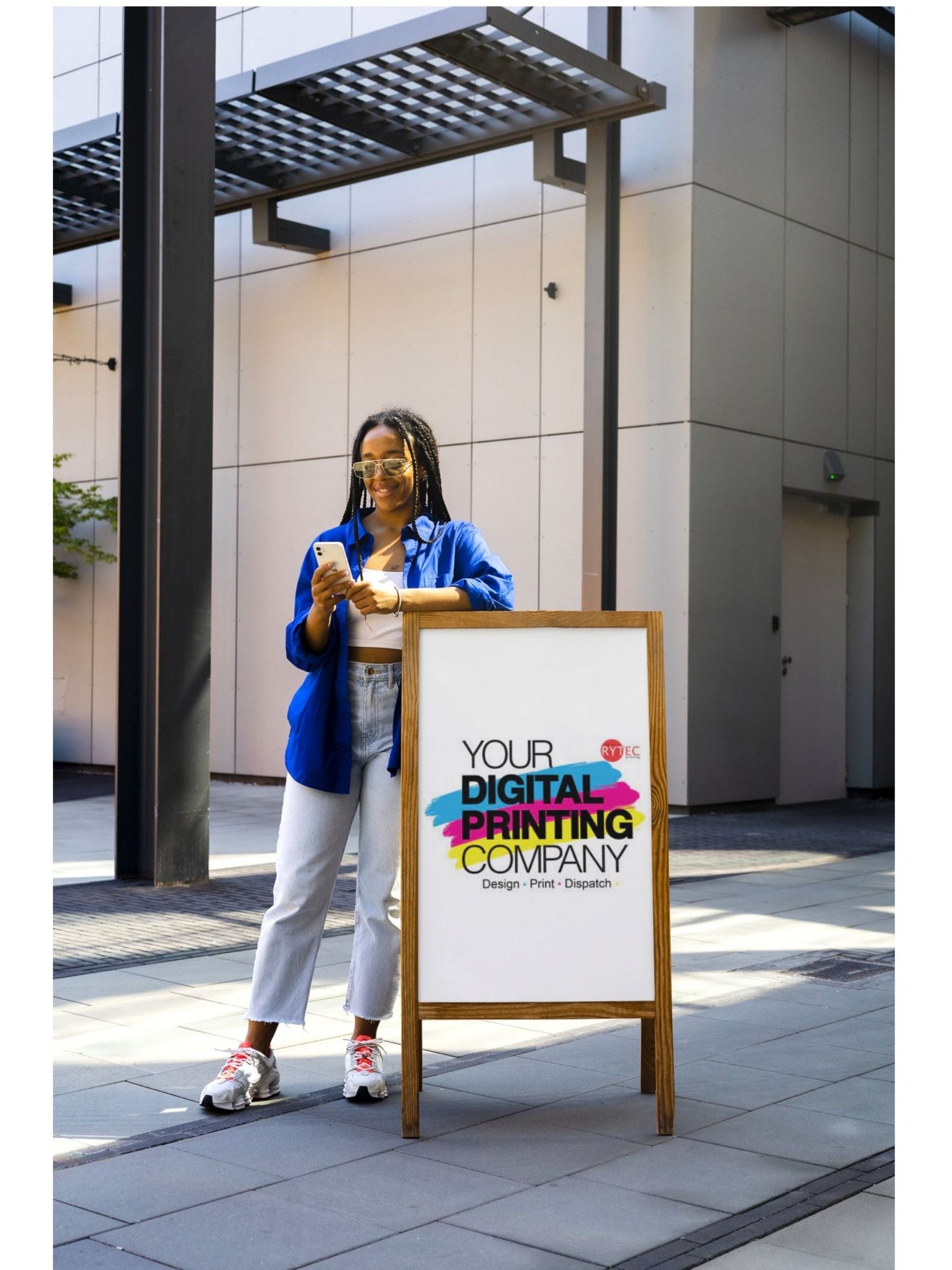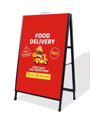 A-sign is a portable, A-frame signboard used for advertising or directional purposes. It stands like the letter "A" and is commonly placed on sidewalks to display messages, promotions, or menus. Great way to showcase your brand.